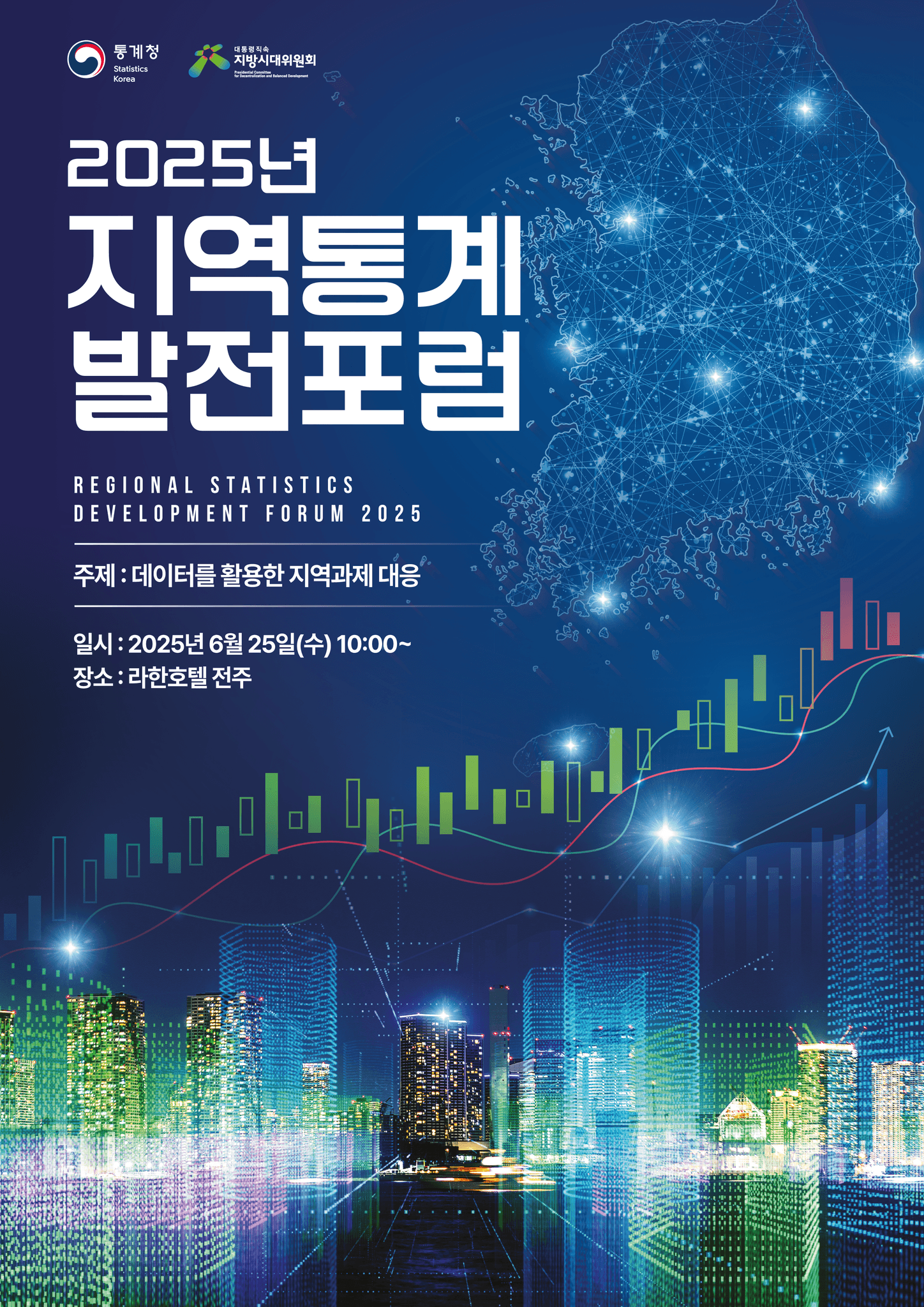 포럼입니다. 2025년 지역통계발전포럼은 지방시대위원회와 공동으로 개최하며 '데이터를 활용한 지역과제 대응'에 대해 다룹니다.